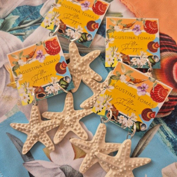 Aros de ceramica hechos a mano con formita de estrella de mar, montados en argollas de acero quirurgico.