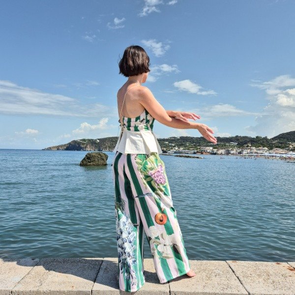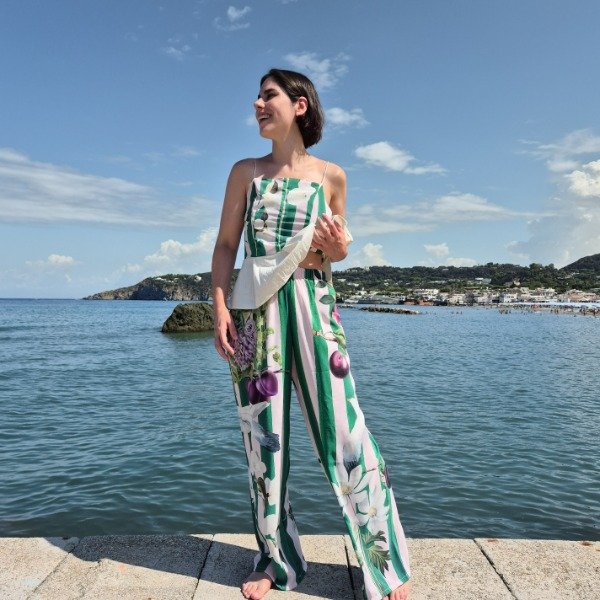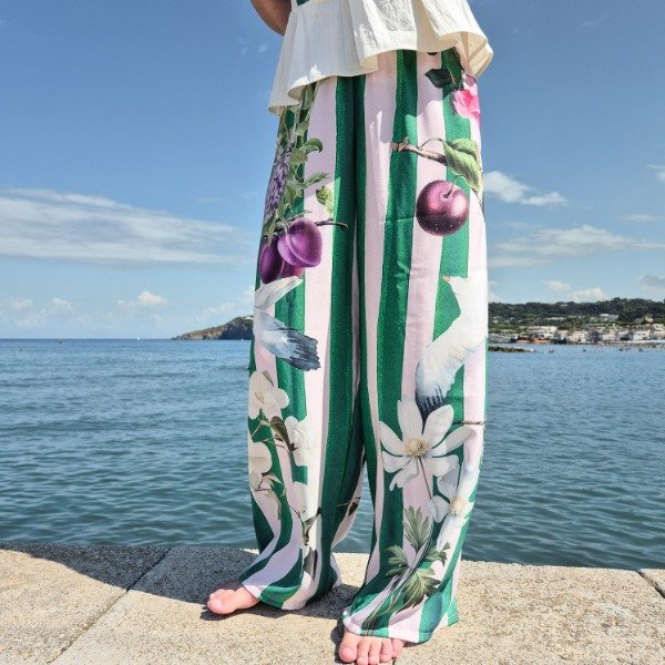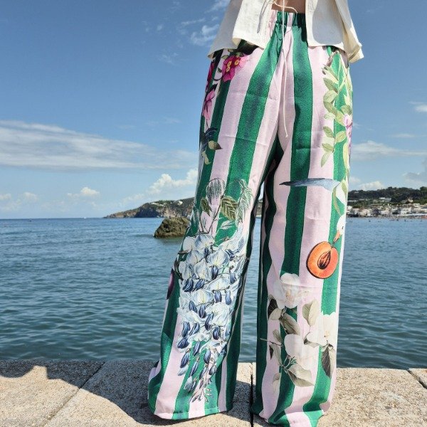 Pantalon de crepe sublimado con una estampa verdaderamente alegre, suelto tiro alto y comodo.