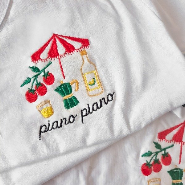 Remera de jersey de algodón, de corte basico y clásico, unisex. La estampa refleja esos elementos del verano italiano y tiene una frase que engloba perfectamente el sentimiento detras de esta colección, PIANO PIANO, ir lento, despacio, con calma.