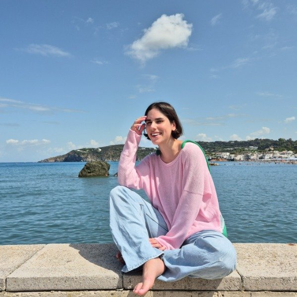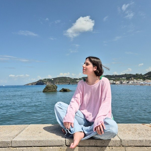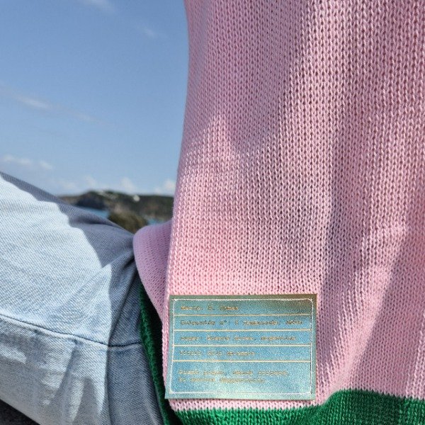 Sweater tejido de forma 100% artesanal en maquina knittax, de algodon, de corte amplio, reversible y con detalle de tiritas para anudar o dejar al viento. Una paleta inspirada en el helado de frutilla, un rosa bebe increible con detalles verde loro que te hacen agua la boca. Al ser amplio viene solo en 2 talles, en fotos uno el talle M.