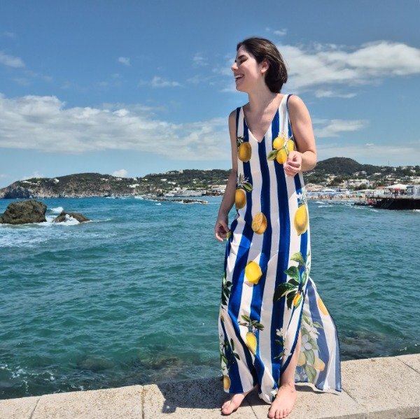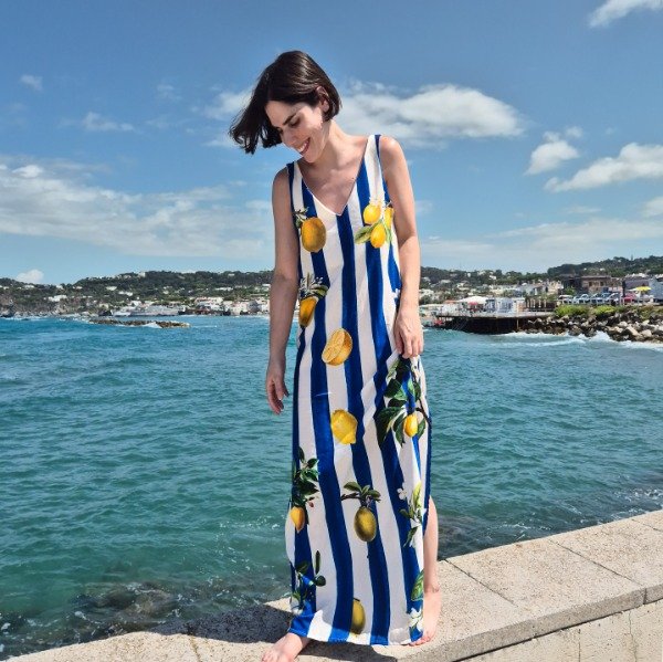 Vestido de crepe con escote reversible y estampa sublimada. De verdad pensaban que iba a hacer una coleccion de verano italiano y dejar atras los limones y las rayas azules? El clasico de clasicos con un toquecito diferente, estos limones vintage flotando de forma surrealista sobre un fondo de rayas de acuarela sobre papel, simplemente un poema.