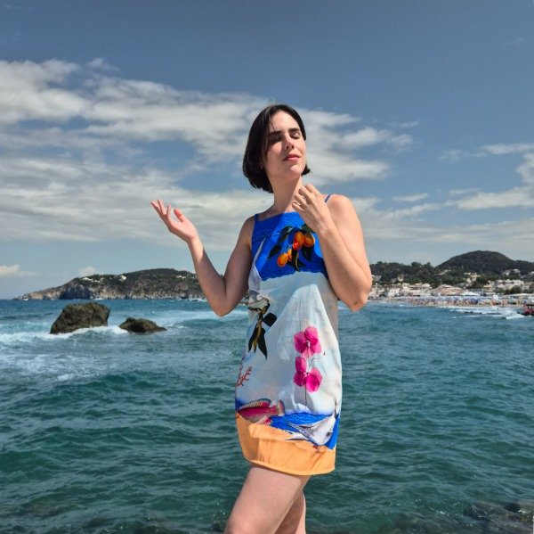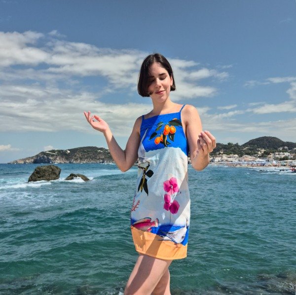 Vestido de crepe con breteles regulables y estampa sublimada. El vestido mar, alegre, colorido, fresco, amamos.