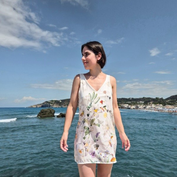 Vestido con escote reversible, de crepe, con estampa sublimada. Esta estampa es MUY especial, ya que es una inspiracion del vestido de novia que diseñe para una de mis mejores amigas. Es versátil, hermoso, etéreo y mega femenino