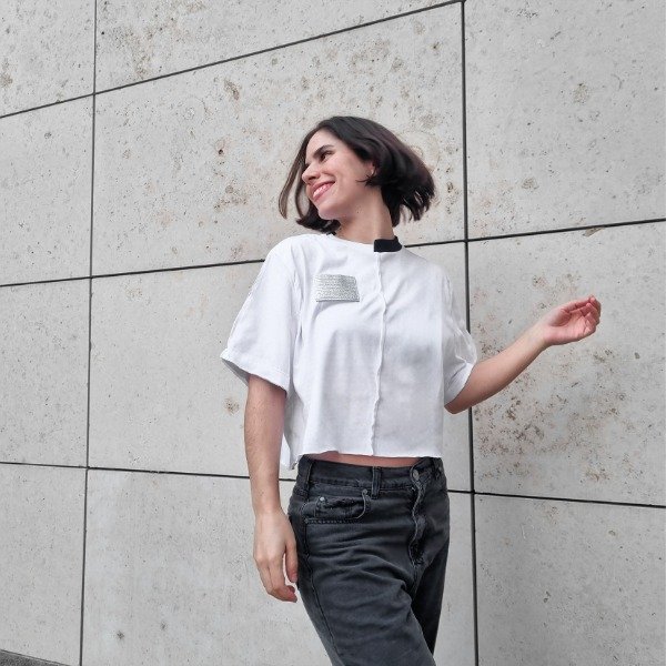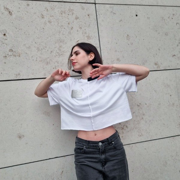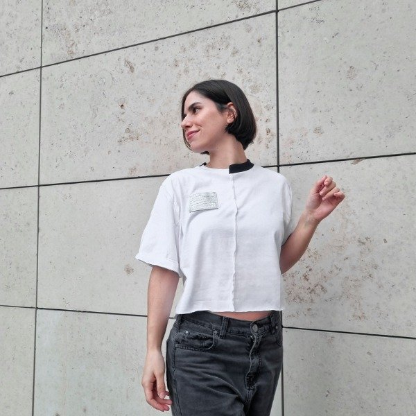 Remera de algodón con etiqueta en ecocuero y bordes al corte. Este item es una muestra, no tiene fallas.