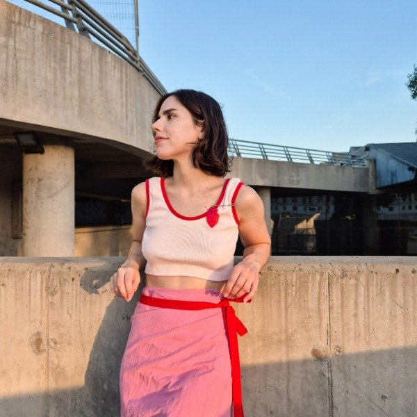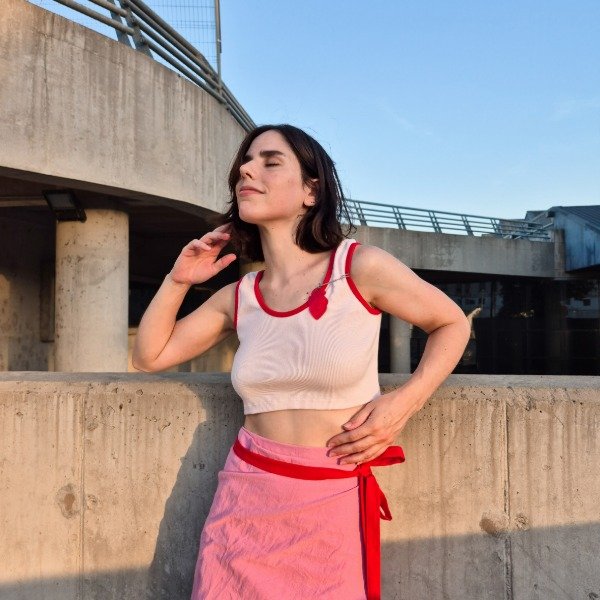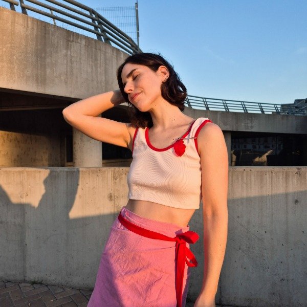Top de rib con bordes a contratono y dije colgante. Este item es una muestra.