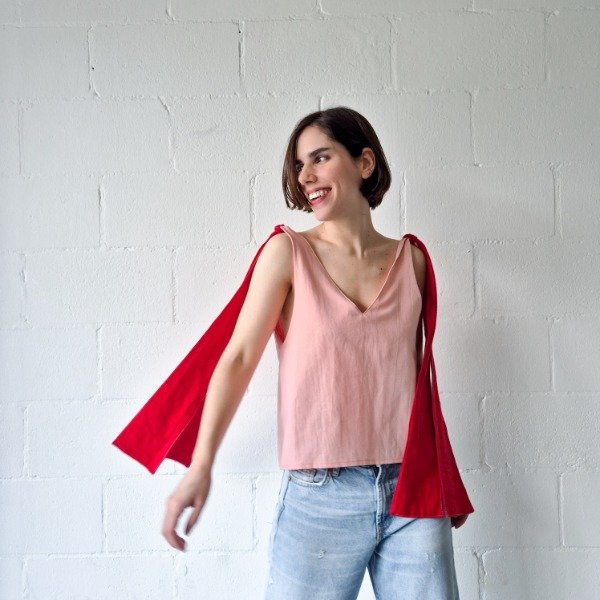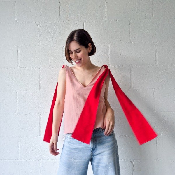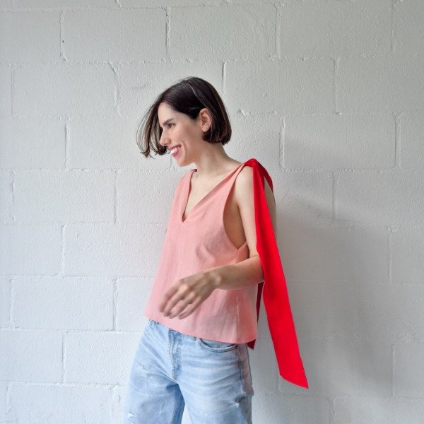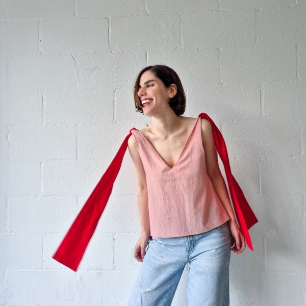 Top de tussor con lazos en hombros. Este item es una muestra.