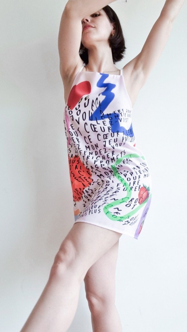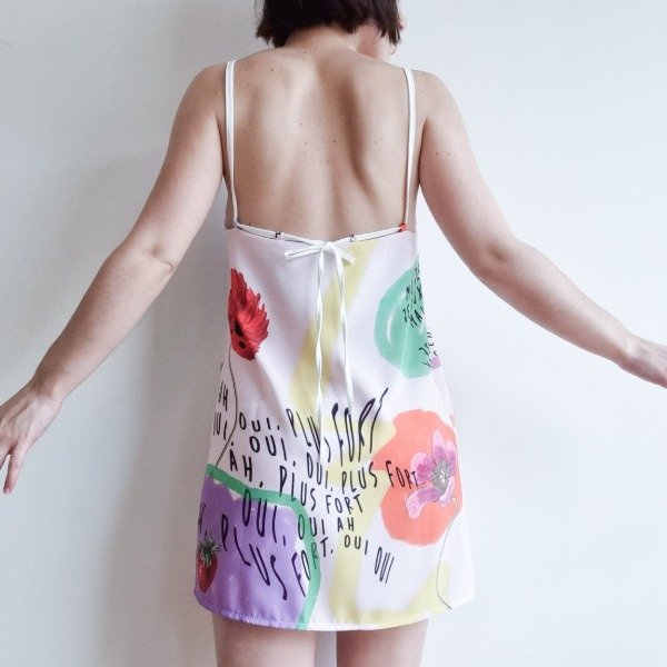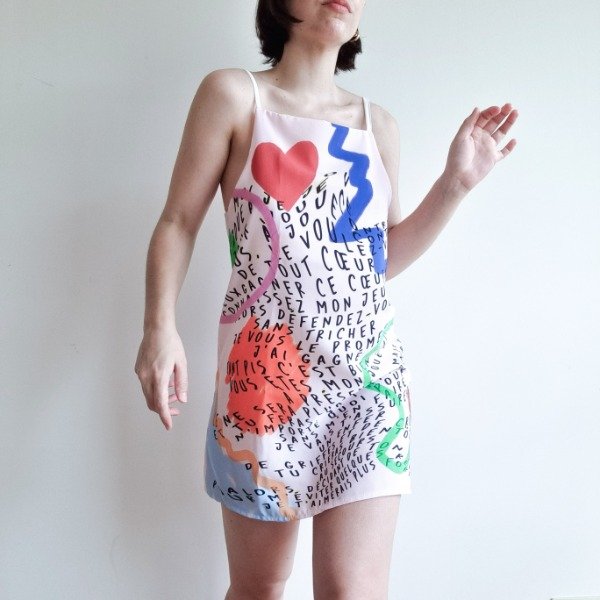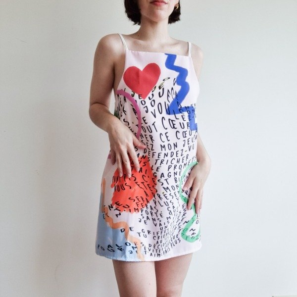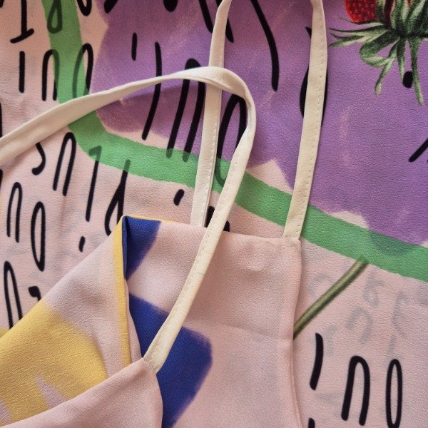 Vestido de crepe sublimado. Este item tiene una pequeña falla en los breteles, no quedaron blancos ya que se mancharon en la plancha de sublimado, como se ve en la ultima foto.