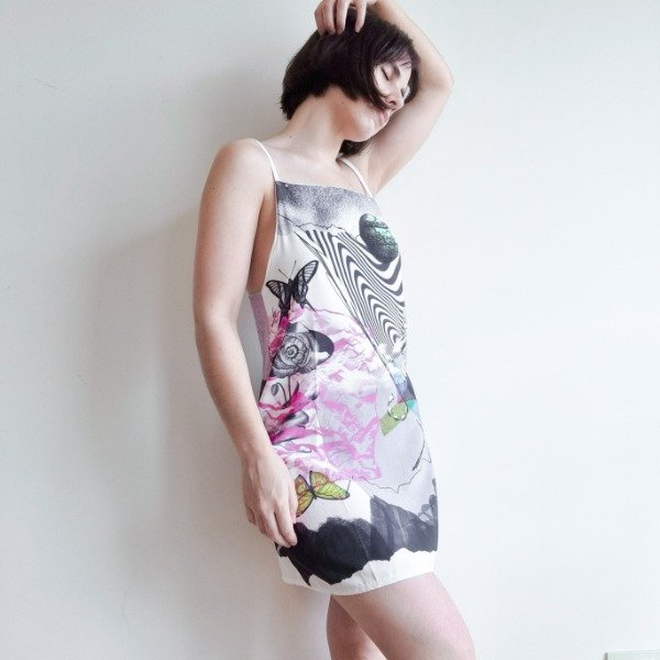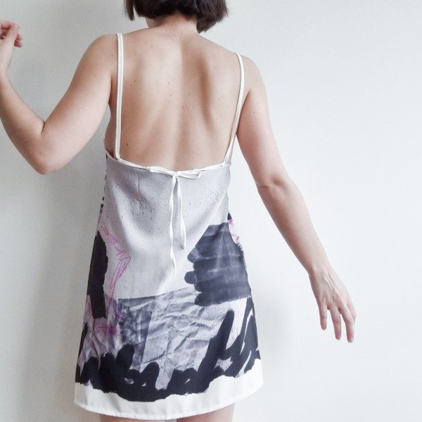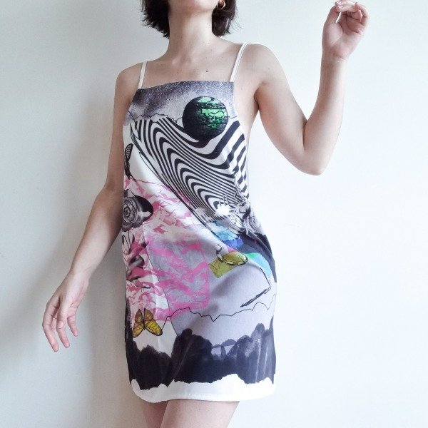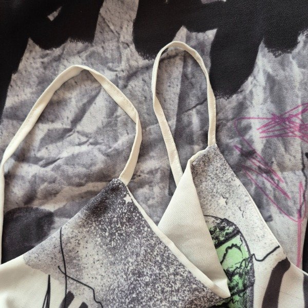Vestido de crepe sublimado. Este item tiene una pequeña falla en los breteles, quedaron de anchos distintos, como se ve en la ultima foto.
