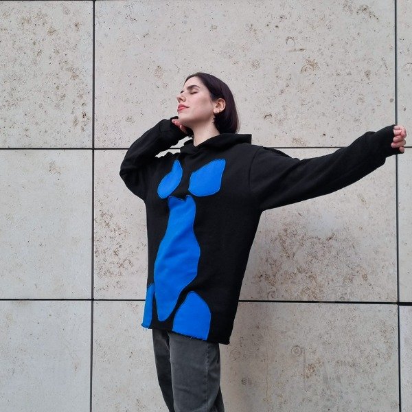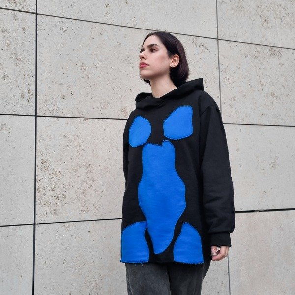 Buzo de jersey de algodon con frisa con apliques al corte en azul. Este item es una muestra, no tiene fallas.