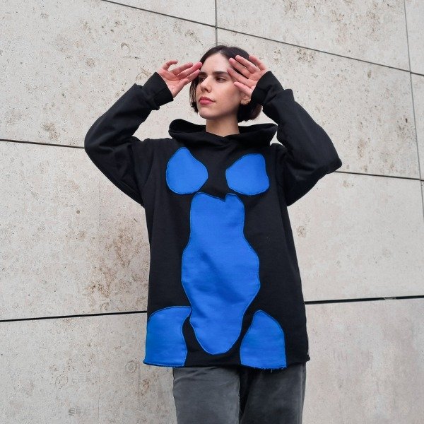 Buzo de jersey de algodon con frisa con apliques al corte en azul. Este item es una muestra, no tiene fallas.